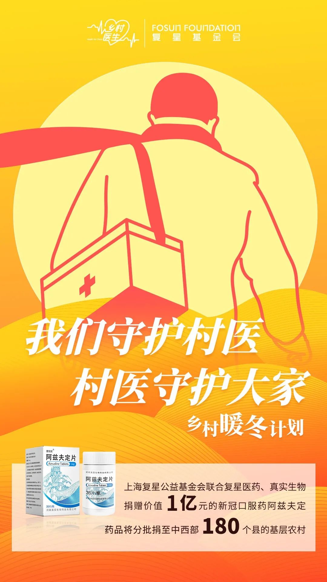 为帮助农村地区平稳度疫,1月6日,复星基金会启动“乡村暖冬行动”,除了捐赠药品,还将联合复星及外部合作伙伴,以线上直播、在线问诊等形式,对农村基层医务工作者开展相应的用药和健康管理培训。在国家卫健委指导下,2017年12月,复星基金会与中国人口福利基金会、中国光彩事业基金会联合发起“健康暖心——乡村医生项目”。五年多来,项目已覆盖全国中西部地区73个县,守护约2.4万名村医,惠及300万农村家庭。在这73个县之外,这次捐赠将再覆盖100多个中西部地区的亟需支持的县域。真实生物创始人王朝阳表示:“随着我国疫情防控进入新阶段,广大农村地区的新冠治疗需求变得更为急迫。真实生物一直非常牵挂基层疫情防治情况,始终坚持人民至上,我们永远愿意在国家最需要的地方,人民最需要的时刻义不容辞、全力以赴守护人民健康,期待阿兹夫定为农村地区渡过疫情难关提供一份助力,保障基层百姓用药需求。”复星国际董事长、复星基金会发起人郭广昌表示,通过乡村医生项目的驻点队员,我们一直在密切关注农村地区疫情防治情况,也特别牵挂村医的困难和需求,“希望阿兹夫定和我们一系列的配套措施,能帮助到广大村医,缓解农村地区诊疗压力,共同筑牢基层健康防线。”