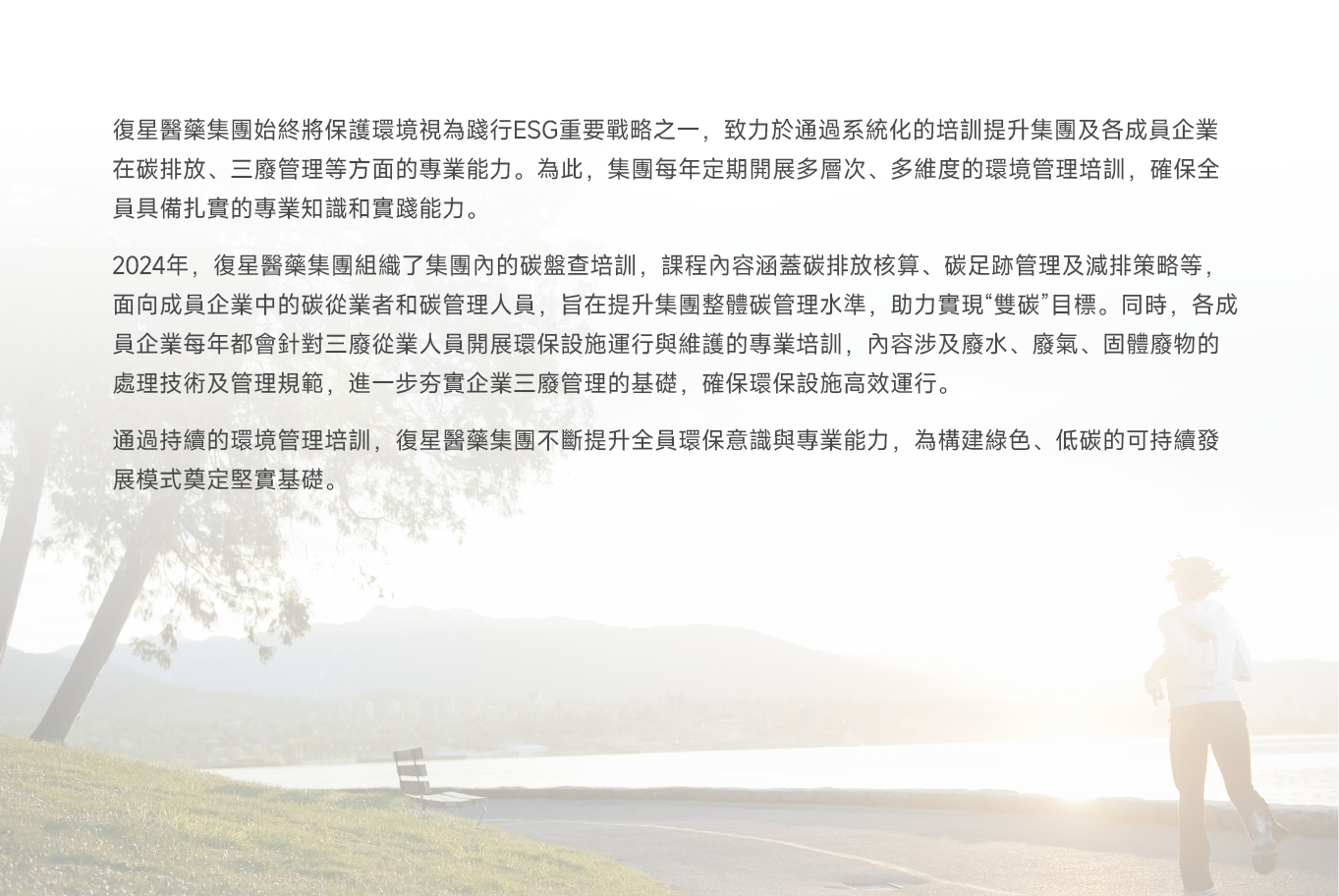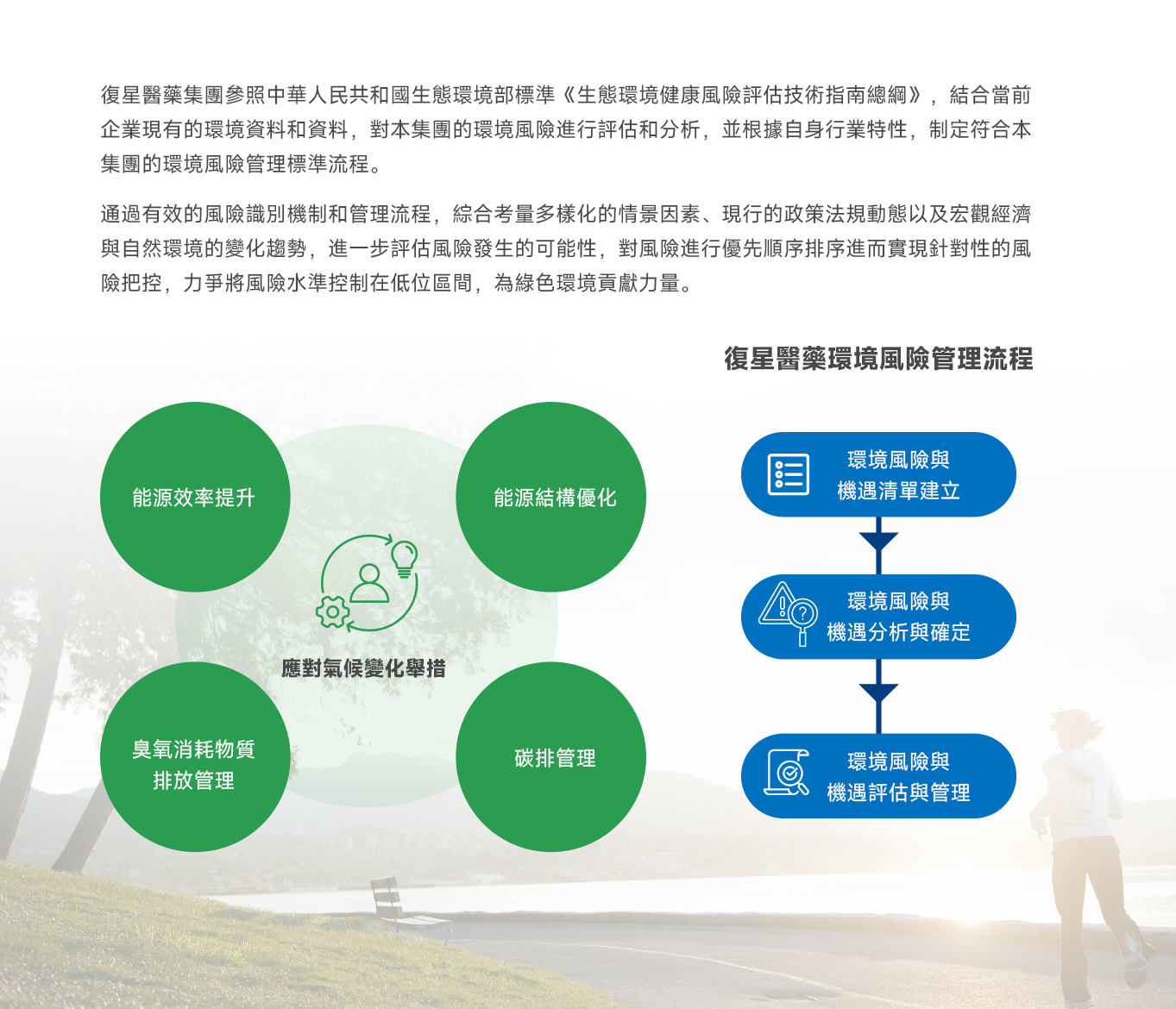 復星醫藥董事會為“應對氣候變化”和“環境管理”議題的最高責任機構,由ESG管理體系全面負責議題的監督、決策、管理和執行。同時,本集團已將“應對氣候變化”和“環境管理”相關目標與指標納入高級管理層績效考核書中。